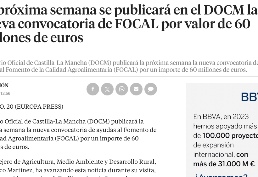20 diciembre, 2018 La próxima semana se publicará en el DOCM la nueva convocatoria de FOCAL por valor de 60 millones Si quieres leer la noticia completa haz clic aquí By cristina CategoriesMedios