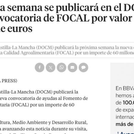 CategoriesMedios By cristina 20 diciembre, 2018 El Gobierno de Castilla-La Mancha publicará la tercera convocatoria de ayudas Focal Si quieres leer la noticia completa haz clic aquí Navegación de entradasPrevious post La próxima semana se publicará en el DOCM la nueva convocatoria de FOCAL por valor de 60 millones Next post El mazapán, producto gastronómico más representativo de Toledo