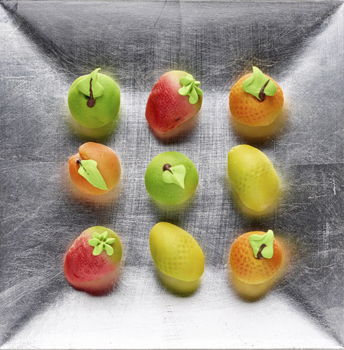 Una obra de arte y de sabores. Estas frutas de mazapán se realizan una a una gracias a nuestros maestros pasteleros. Tienen un núcleo de chocolate rellenas de gelatinas del mismo sabor que en la fruta que representa y se cubre con una fina capa de mazapán, al que se da forma manualmente de naranja, limón, albaricoque, manzana y fresa. Son una explosión de sabores, no deja a nadie indiferente.